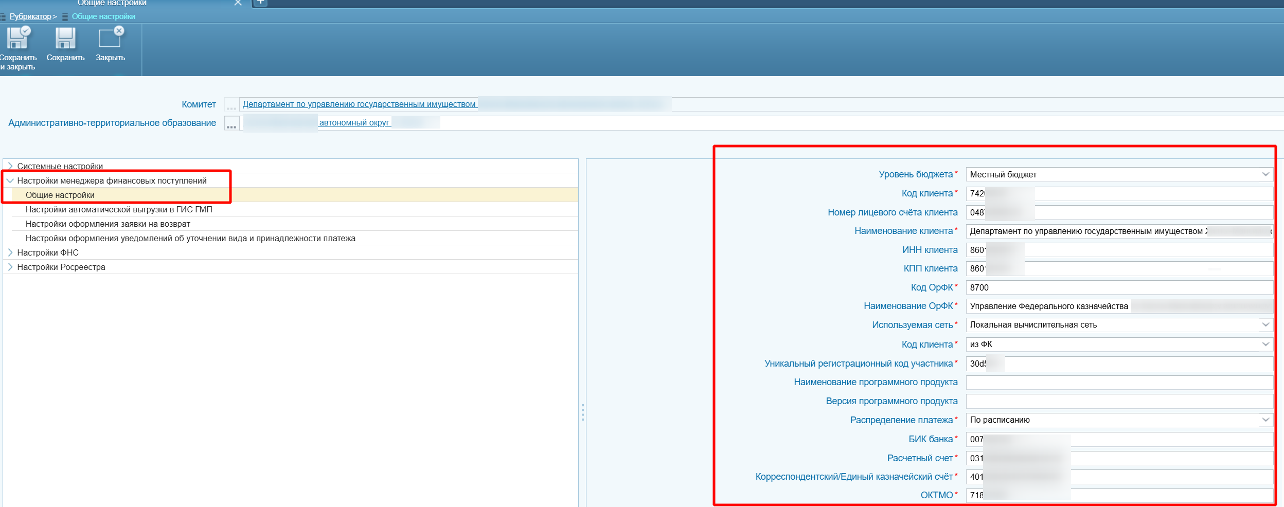 В разделе «Настройки – «Общие настройки» - «Настройки менеджера финансовых поступлений» - «Общие настройки» должны быть заполнены следующие поля (Рисунок 1):