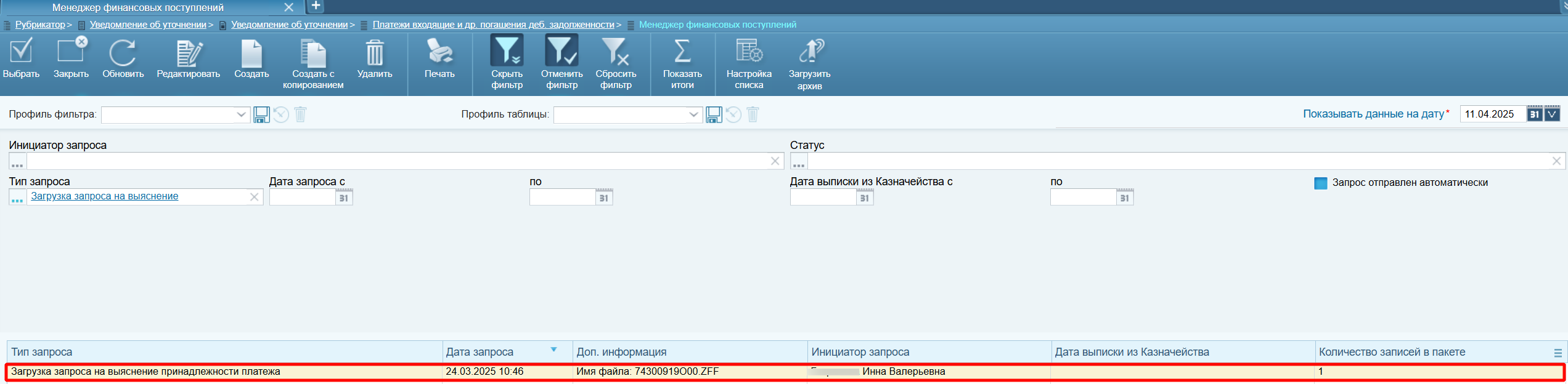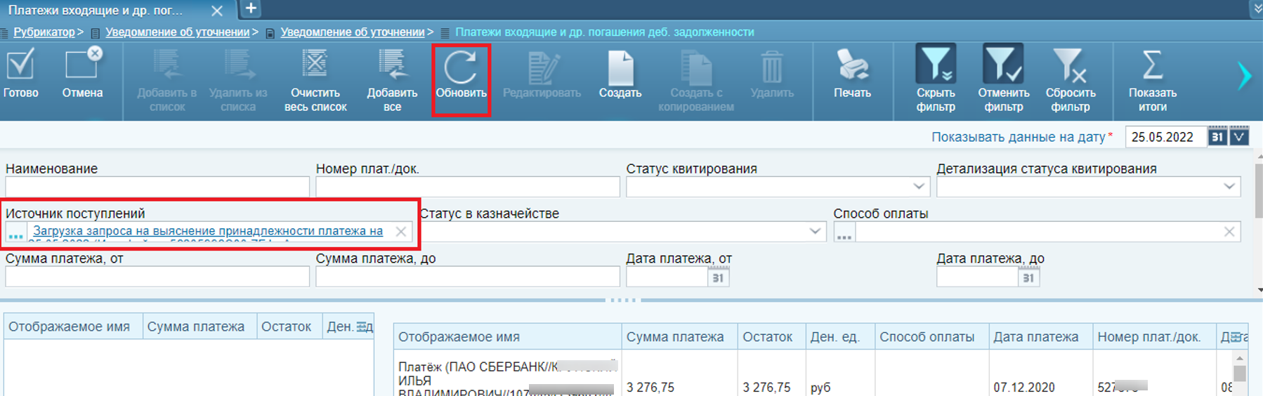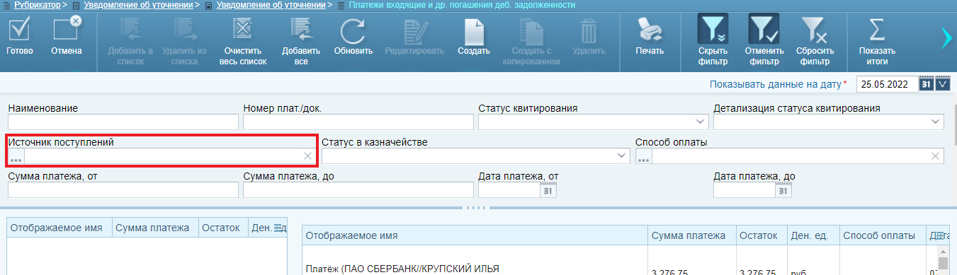 После выбора файла, система вернется на панель фильтрации, где ранее из справочника был выбран «Источник поступлений». Для применения фильтрации по данному значению на инструментальной панели необходимо нажать на «Применить фильтр» или «Обновить» (Рисунок 10).