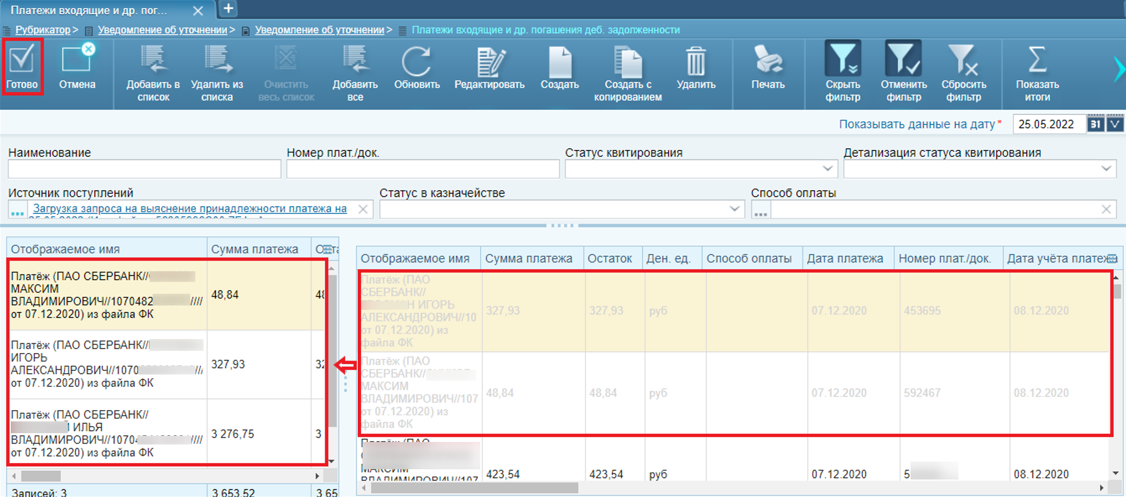 Для выбора платежей необходимо перетащить значения из правой части экрана, в левую часть экрана, после этого на инструментальной панели нажать на кнопку «Готово» (Рисунок 11).