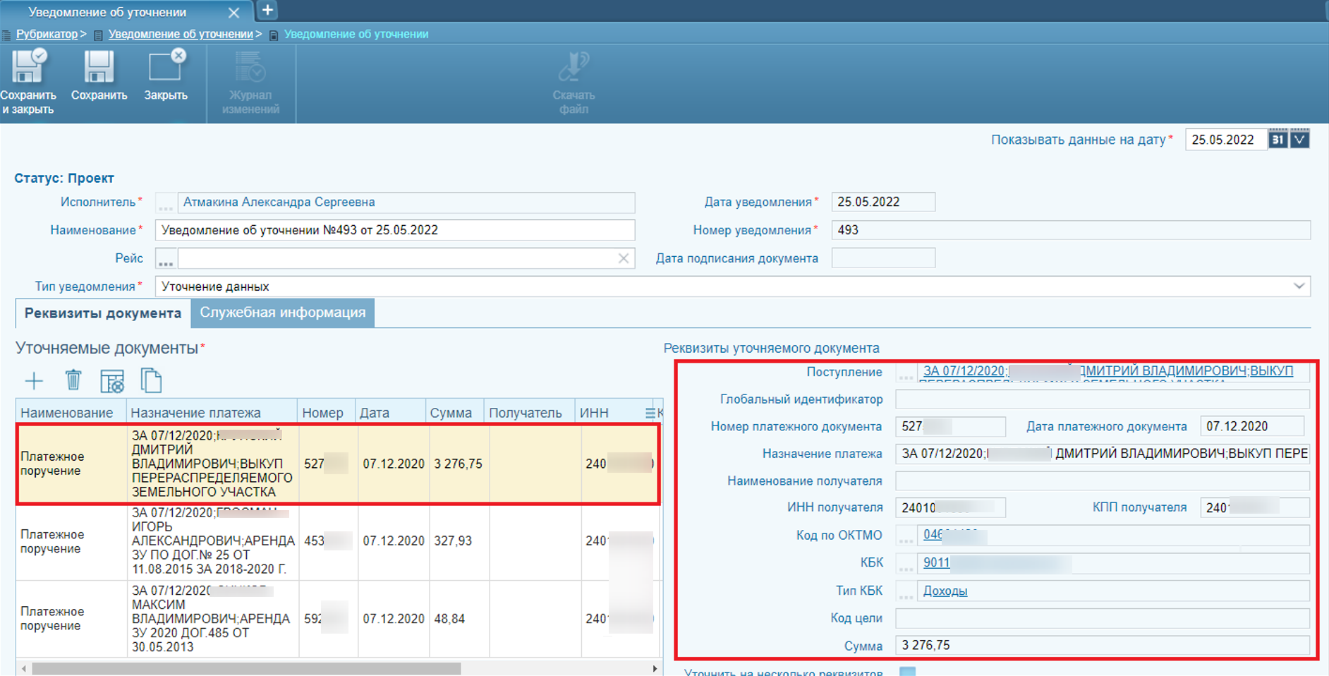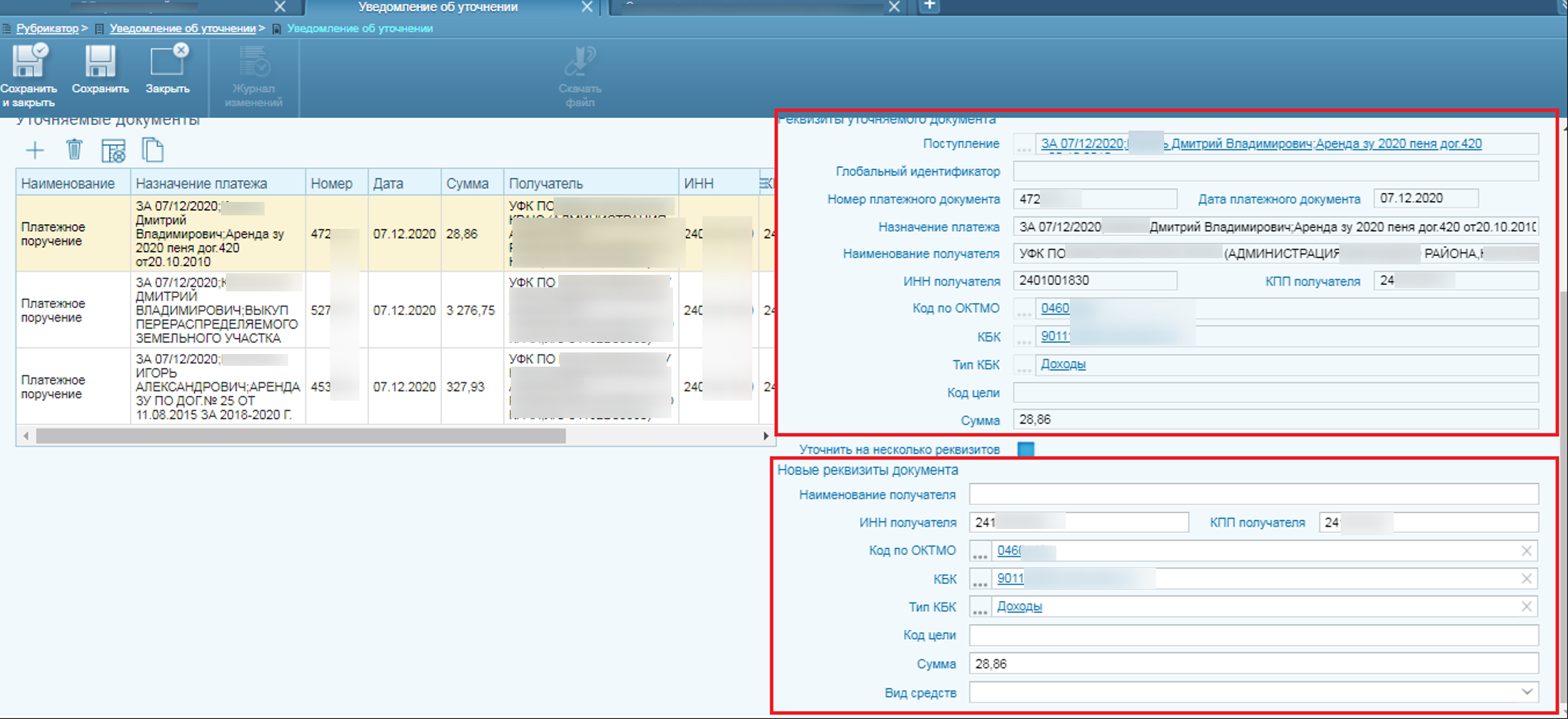 Все выбранные платежи будут отображены в правой части экрана в «Уточняемые документы». При выборе строки платежа в таблице «Уточняемые документы» данные по платежу отображаются в полях справа, в блоке «Реквизиты уточняемого документа» (Рисунок 12).