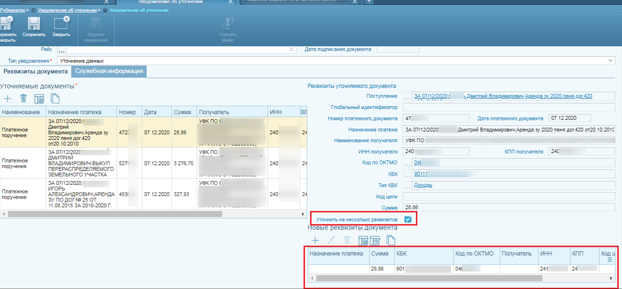 При необходимости ввести уточнение с разбитием платежа на несколько уточнений необходимо в поле «Уточнить на несколько реквизитов» поставить галочку. В таком случае форма в блоке «Новые реквизиты документа» изменится на табличное представление (Рисунок 14).
