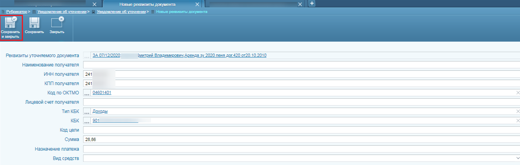 По правую сторону экрана, под блоком «Реквизиты уточняемого документа» находится блок «Новые реквизиты документа». Именно в поля этого блока следует вносить данные по уточнению (Рисунок 13).