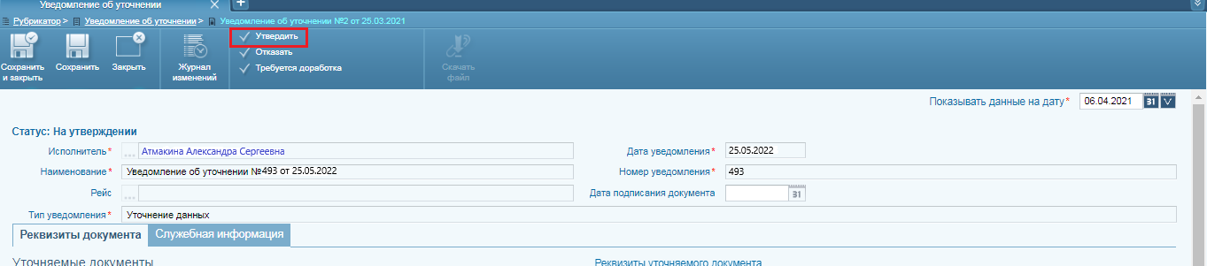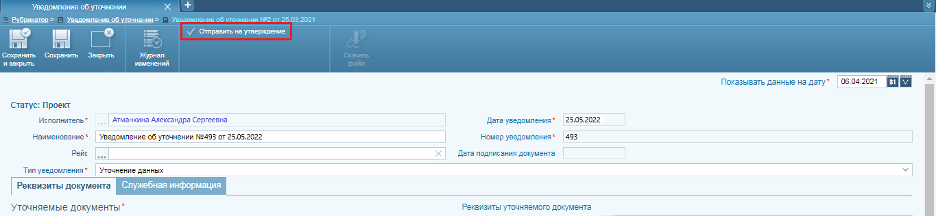 После того, как все данные об уточнении были внесены, необходимо нажать на инструментальной панели кнопку «Сохранить». После сохранения изменений на инструментальной панели станет доступна кнопка «Отправить на утверждение», для отправки его на утверждение (Рисунок 16).