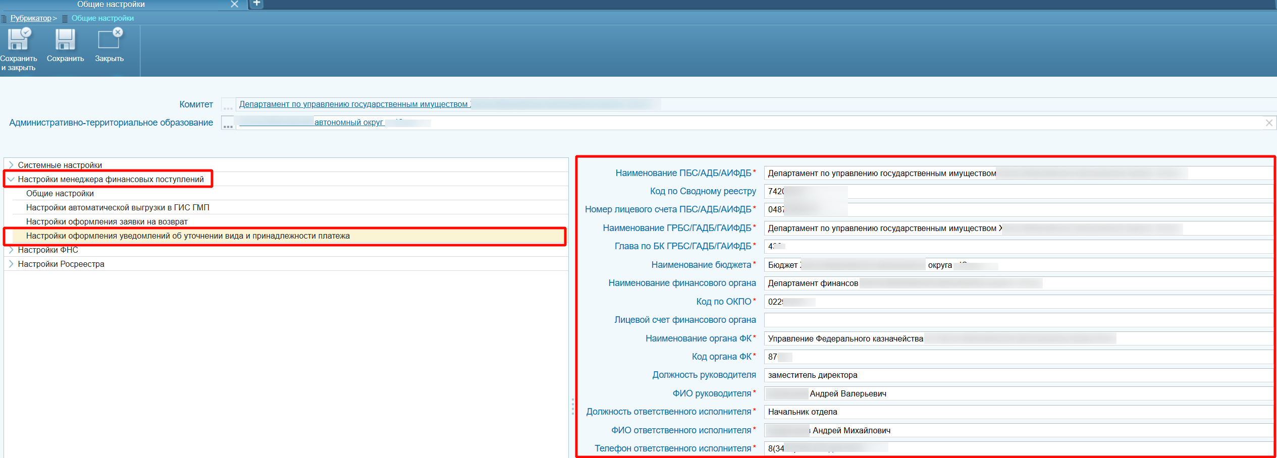В разделе «Настройки» - «Общие настройки» - «Настройки менеджера финансовых поступлений» - «Настройки оформления уведомлений об уточнении вида и принадлежности платежа» должны быть заполнены следующие поля (Рисунок 2):