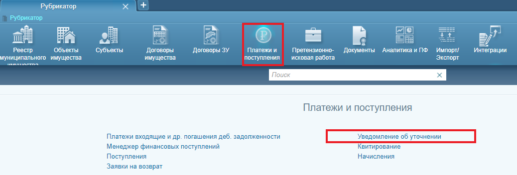 Для формирования такого файла на инструментальной панели системы необходимо перейти в «Платежи и поступления» и выбрать раздел «Уведомление об уточнении» (Рисунок 3).