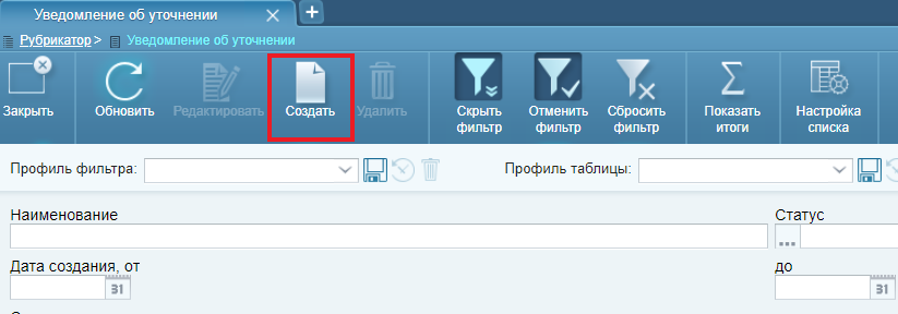 На инструментальной панели раздела необходимо нажать на кнопку «Создать» (Рисунок 4).