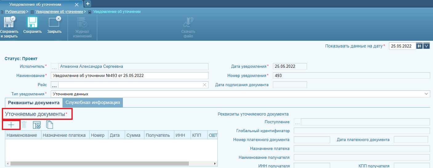В открывшемся окне, в поле «Уточняемые документы» необходимо нажать на знак «+» для добавления документов для уточнения (Рисунок 5).