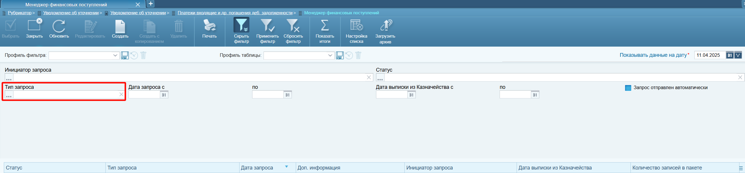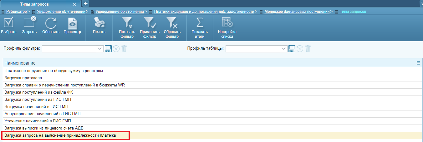 После перехода по полю «Источник поступлений» на панели фильтрации необходимо выбрать «Тип запроса». Значение выбирается путем нажатия на «